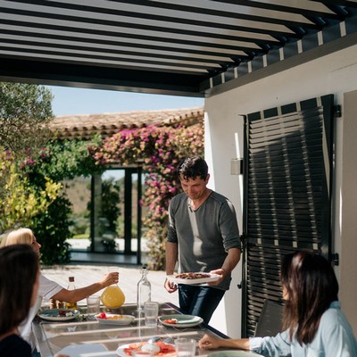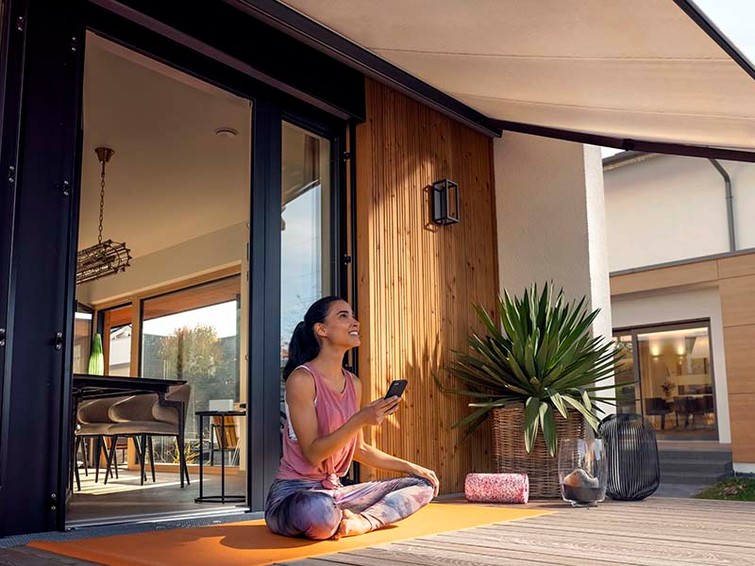 Om kvelden kan du skape en koselig stemning ved å senke markisen automatisk. Terrassen blir en naturlig forlengelse av den hyggelige atmosfæren inne. Og når det blir litt kjøligere eller mørkere, har Somfy en smart løsning.