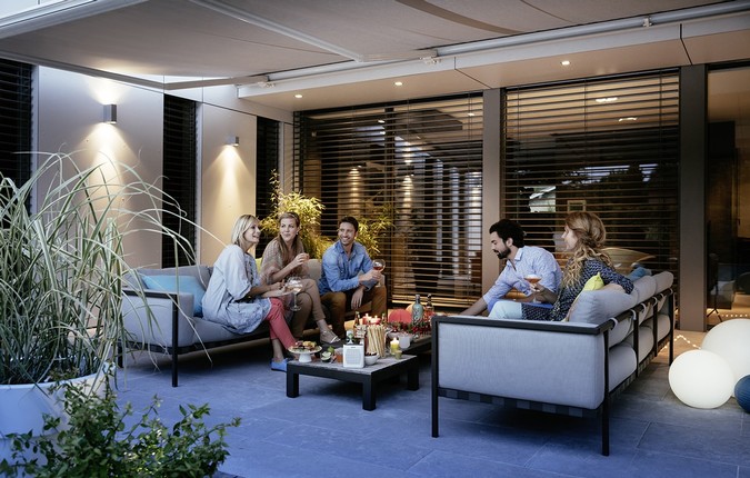 Med en motorisert pergola sitter du alltid tørt. Ved de første regndråpene kan du lukke taket og slå på lyset med ett klikk på telefonen. Du kan bli sittende hele kvelden – eller natten.