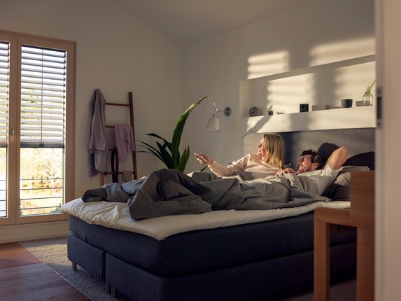 Still inn enhetene i hjemmet slik at de sparer energi. La solskjerming eller rulleskodder reagere på værforholdene, slik at solskjermingen for eksempel lukkes automatisk når temperaturen overstiger et forhåndsinnstilt nivå. Slik reduserer du behovet for kjøling og oppvarming.
