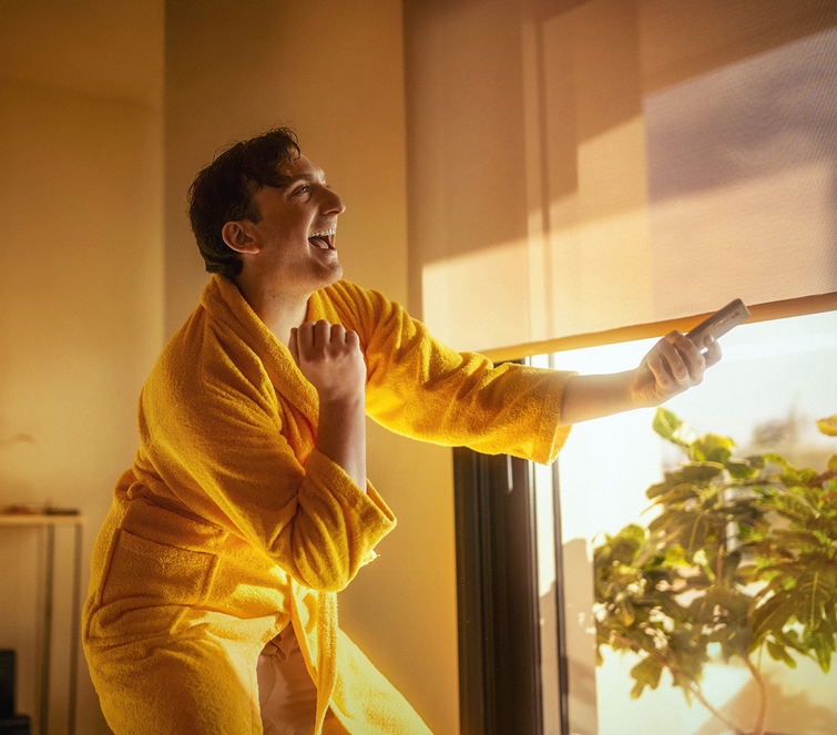 Med TaHoma er personvernet ditt alltid ivaretatt. Etter en lang dag kan du slappe av hjemme ved å senke innvendige persienner eller screens, dempe belysningen og spille favorittmusikken din – alt enkelt med ett trykk i appen eller med stemmen. TaHoma gjør hjemmet ditt til et perfekt privat fristed.