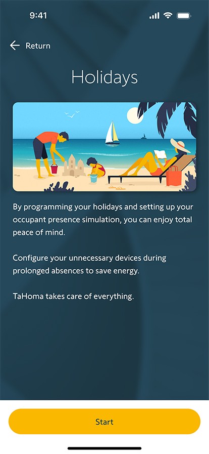 Slapp av i ferien med full trygghet. Fra TaHoma-appen kan du programmere rullegardiner, persienner eller belysning til å styres på faste tidspunkter eller med tilfeldige intervaller, slik at det ser ut som om noen er hjemme. For enda bedre sikkerhet kan du utvide systemet med en Somfy-kompatibel sikkerhetsprodukter.